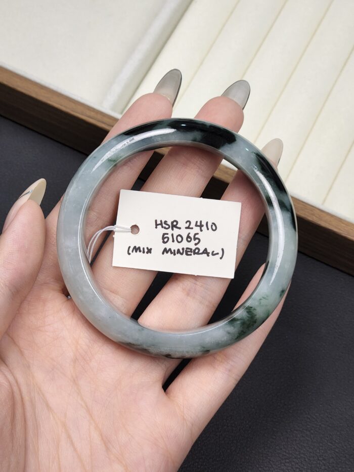 Size 54.7 White with Dark Green Floral (Mix Mineral) Burmese Jade Bangle (DZ0277)