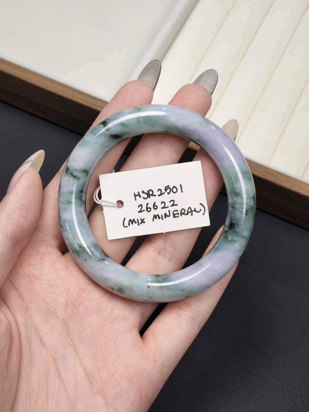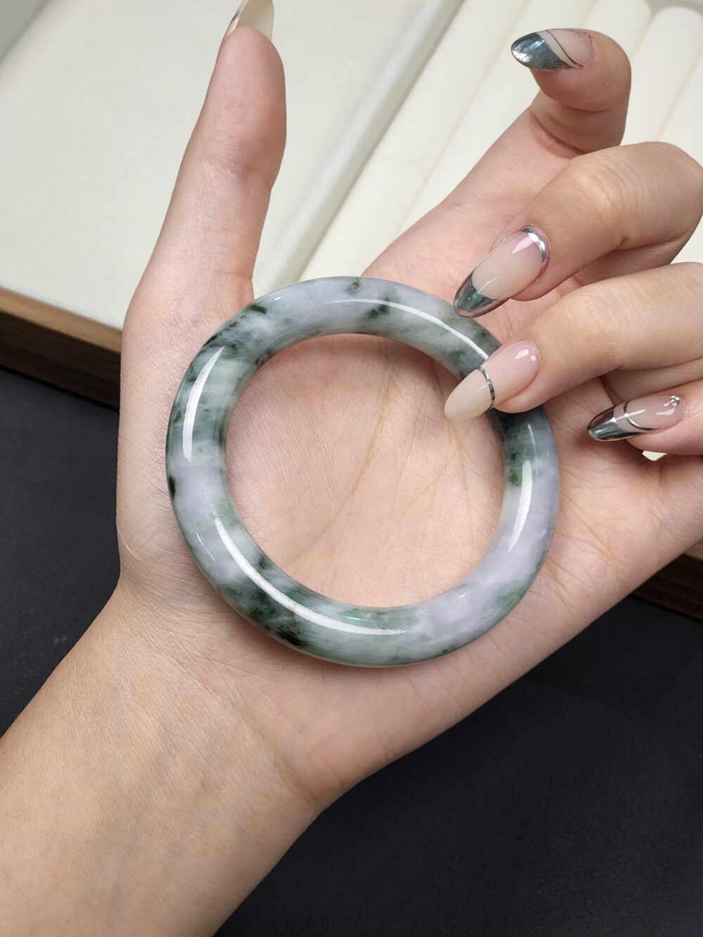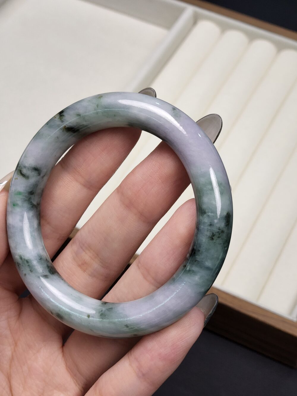 Mineral: Natural Type A Jadeite Bangle (Untreated & Undyed) + Contains other natural mineral known as Amphibole