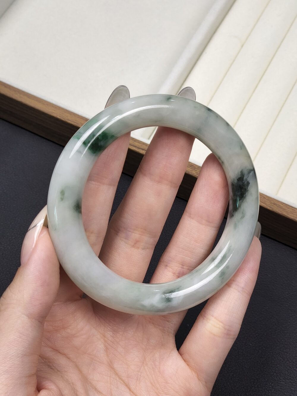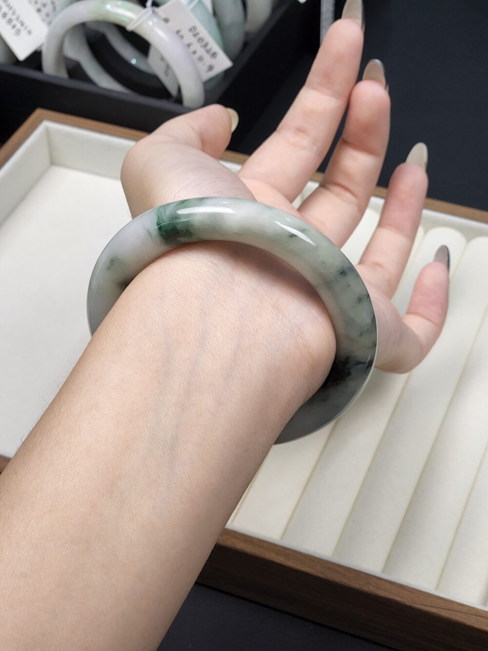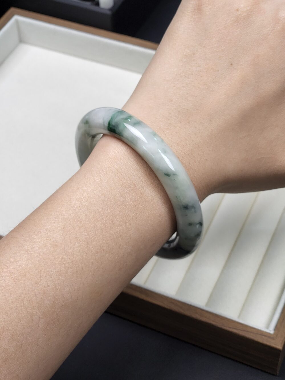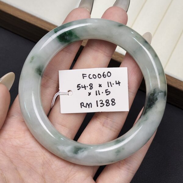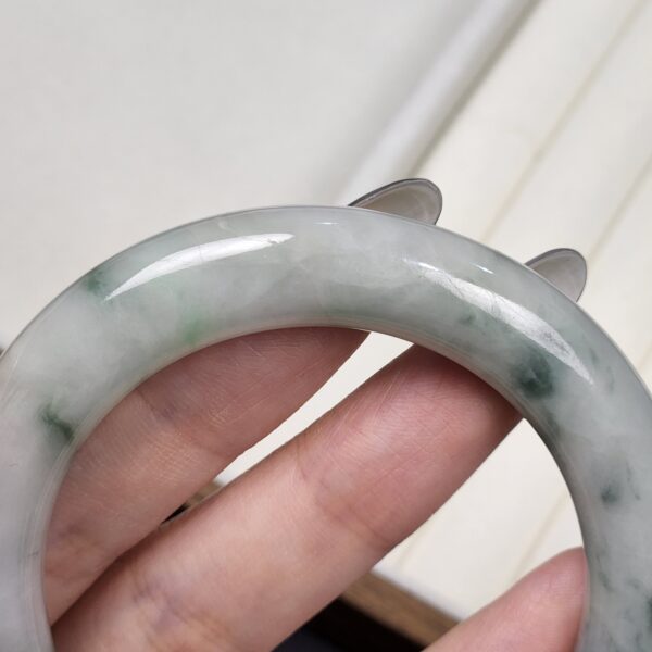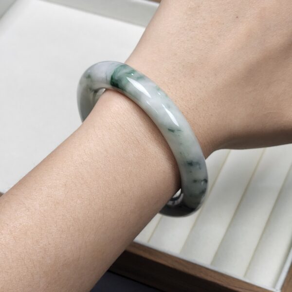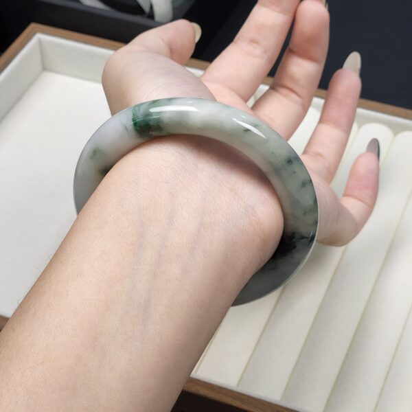 Size 54.8 White Milky with Imperial Green & Black Floral Burmese Jade Bangle (FC0060)