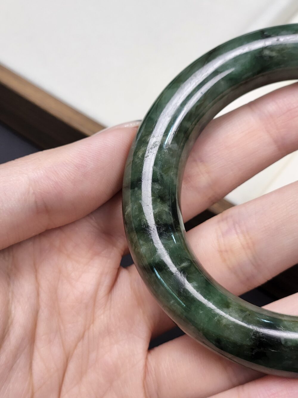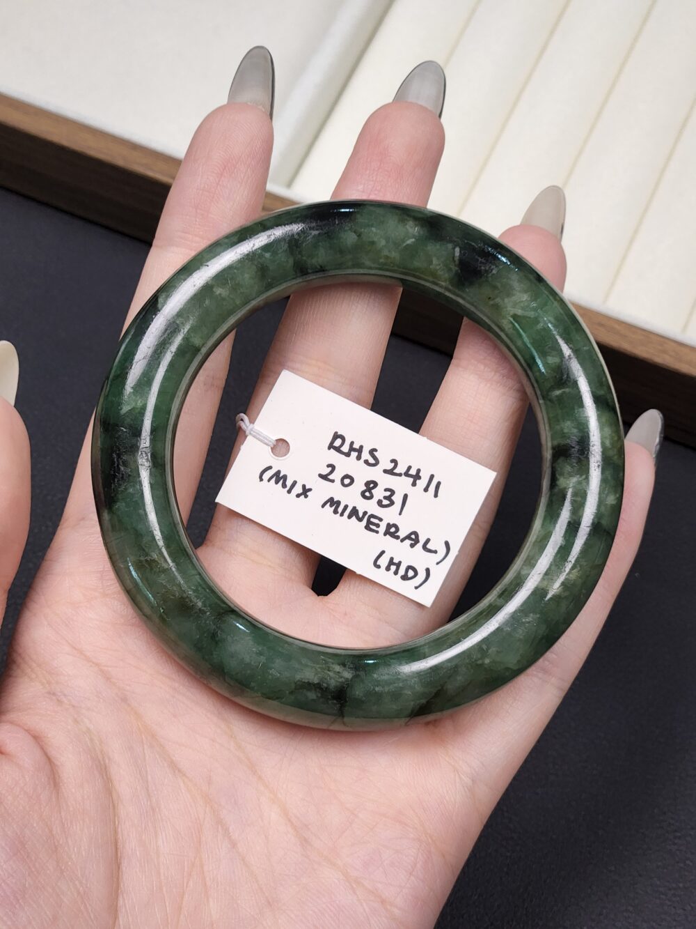 Mineral: Natural Type A Jadeite Bangle (Untreated & Undyed) + Contains other mineral known as Amphibole
