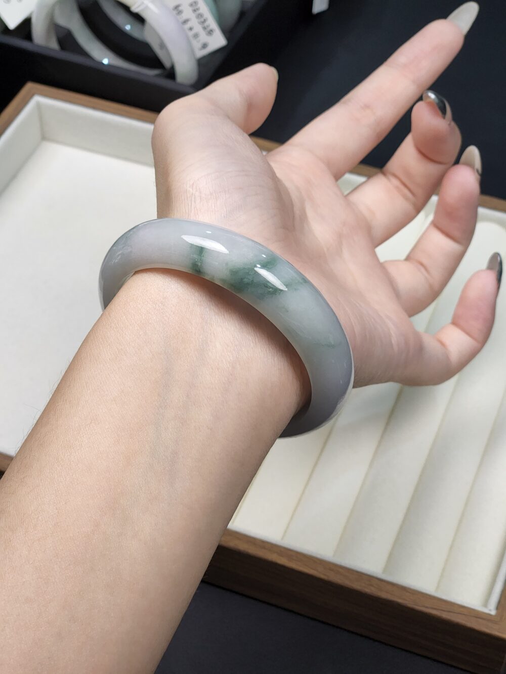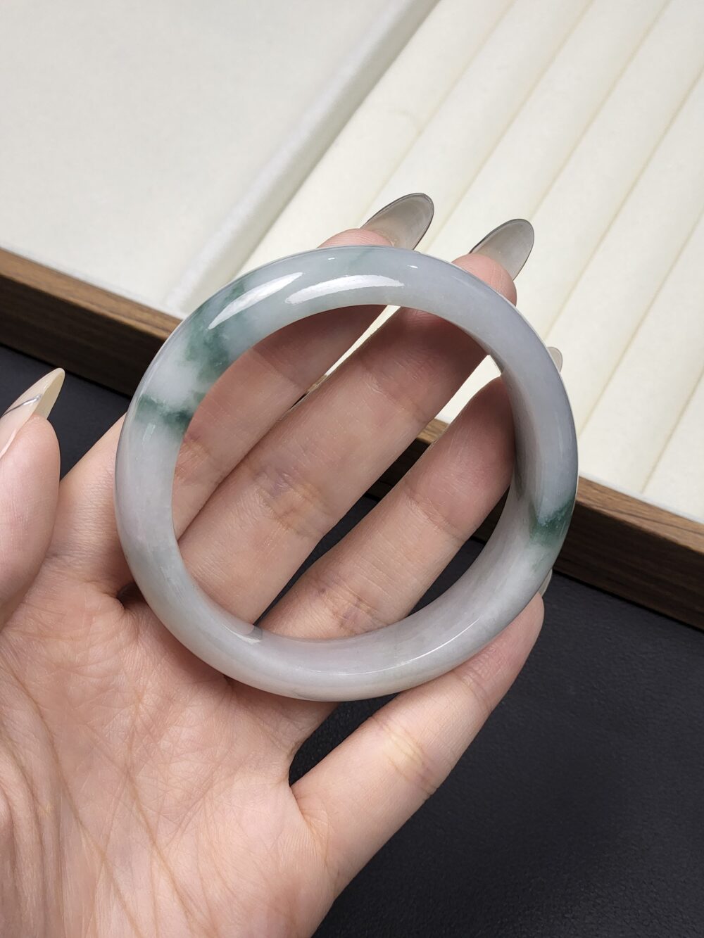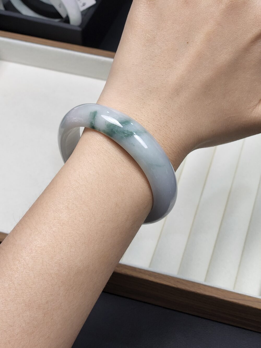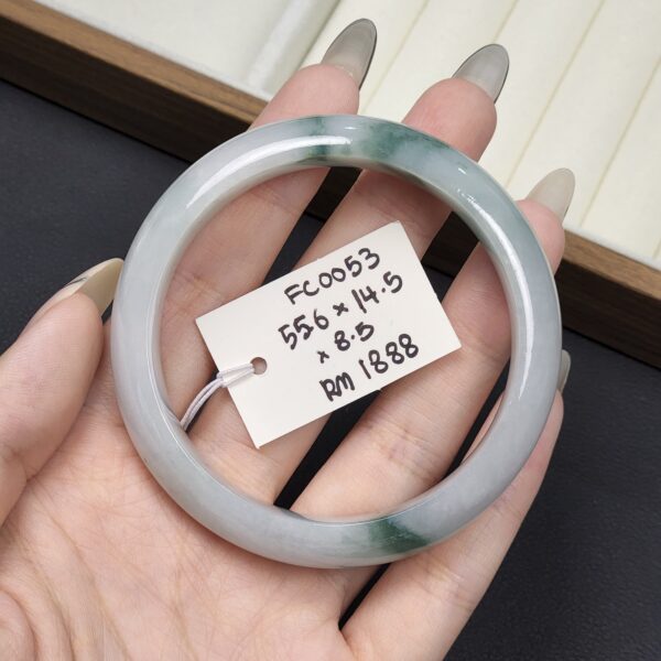 Be the first to review “Size 55.6 White Milky with Forest Green Floral Burmese Jade Bangle (FC0053)”